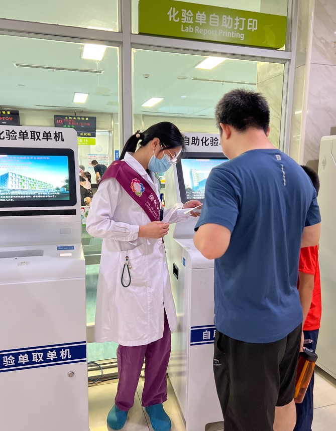 考虑到CICU工作需要,我们分别在6月21日和6月28日(两个周三)上午进行门诊志愿服务,在医务社工部的安排下,我们被安排在了人流量最多的地方:各个楼层的自助机和抽血报告打印处。解决患儿家长不会使用机器、不熟悉门诊分布、不熟悉门诊看病流程,最大程度的减少患儿及家长跑腿次数,努力践行“最多跑一次”。