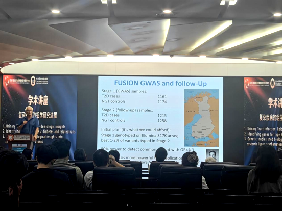 接着,Michael Boehnke教授作题为“Identifying genes for type 2 diabetes and related traits”的报告。在报告中,他回顾了2型糖尿病现代遗传学研究的历史和未来发展方向,介绍了FUSION国际研究在多个团队紧密合作下的发展里程,并介绍了连锁分析、GWAS等多种2型糖尿病遗传统计学研究方法,并强调加强团队合作对推进未来研究的重要意义。讲座内容深入浅出,现场学术氛围浓厚,我院相关科室研究人员积极参与互动,就多个专业问题与外宾进行了深入探讨。最后,尹先勇教授分享了“系统性红斑狼疮的遗传学研究与生物学机制”这一前沿课题的最新进展。