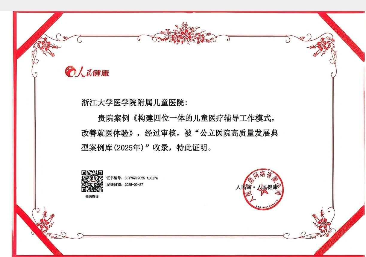 来源: 发布时间:2025-09-289月27日,“2025公立医院高质量发展交流总结暨典型案例发布仪式”在广州举行。会议发布“公立医院高质量发展典型案例库(2025年)”,浙江大学医学院附属儿童医院报送的以Child Life项目为主要内容的《构建四位一体的儿童医疗辅导工作模式,改善就医体验》被收录其中。会上还举行了“公立医院高质量发展研究中心专家”聘任仪式,浙大儿院党委书记章伟芳受聘成为“公立医院高质量发展研究中心专家”,将在新的平台上为公立医院高质量发展贡献“浙儿智慧”。