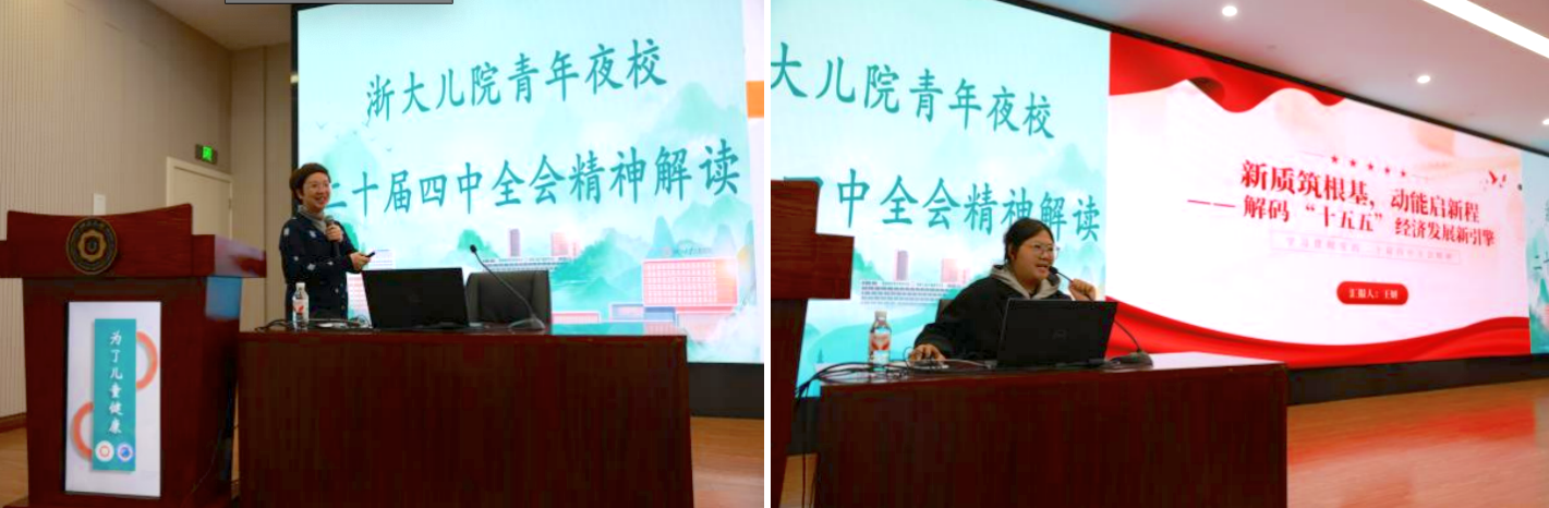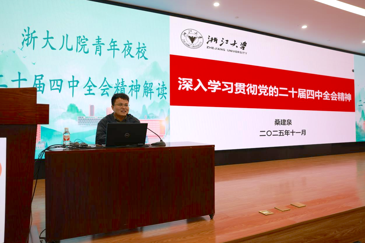 课程核心环节聚焦理论赋能与专业实践,呈现多维学习内容。浙江大学马克思主义学院副教授桑建泉深入解读党的二十届四中全会精神,帮助青年群体准确把握党的最新理论成果;马克思主义学院学生讲师团王妍以“新质筑根基,动能启新程——解码‘十五五’经济发展新引擎”为题开展微党课,生动阐释新质生产力内涵与经济发展新趋势;浙大儿院内分泌科青年文明号团队带来儿童生长发育科普课程,护士长陈晓春通过互动式讲解普及健康知识,实现思政学习与专业传播的有机结合。