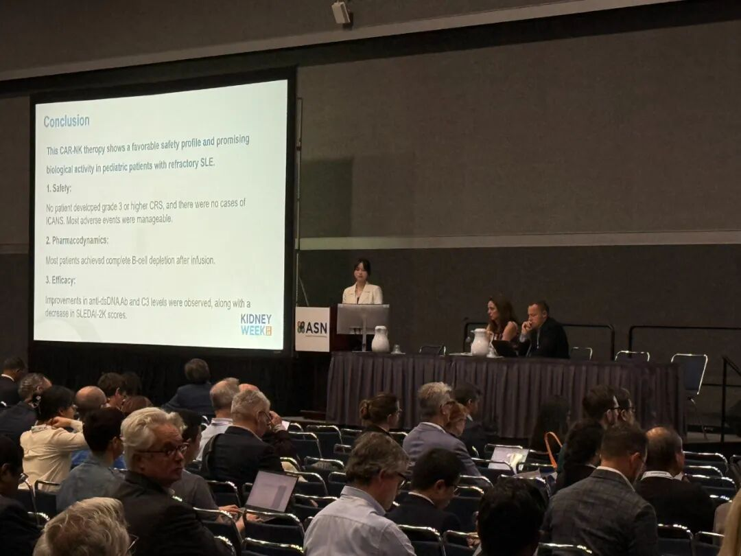 作为国家儿童健康与疾病临床医学研究中心、国家儿童区域医疗中心,浙大儿院长期聚焦儿童难治性肾脏疾病与自身免疫性疾病的诊疗突破。此次在 ASN Kidney Week 2025上,由刘飞副主任医师、孟涵燕博士后领衔的团队,代表研发与临床团队报告了 “Anti-CD19/BCMA 双靶点 CAR-NK 细胞(KN5601)治疗儿童复发/难治性系统性红斑狼疮”的初步临床研究随访成果。该疗法由浙大儿院与深圳恩瑞恺诺联合研发,针对儿童SLE这一临床难题,创新采用双靶点 CAR-NK 细胞技术,通过深度清除异常B细胞群,助力患儿实现免疫重建,摆脱长期激素与免疫抑制剂依赖。