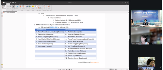 来源: 发布时间:2025-12-0812月4日,亚太儿科内分泌学会(APPES)在线上召开2025年度总结大会,APPES主席、浙江大学医学院附属儿童医院傅君芬教授作年度工作报告,全面回顾了APPES在推动学会国际化、学术创新与区域合作方面取得的突出成就。本次会议共有19名理事会成员出席,包括前任主席Maria Craig(澳大利亚)、候任主席Sylvia Estrada(菲律宾)、秘书长Azriyanti Anuar Zaini(马来西亚)、财务长Alexia Peña(澳大利亚)等来自亚太地区各成员国的代表。我院内分泌科主任吴蔚和国合办主任张凌作为APPES理事和学会秘书一起参会。