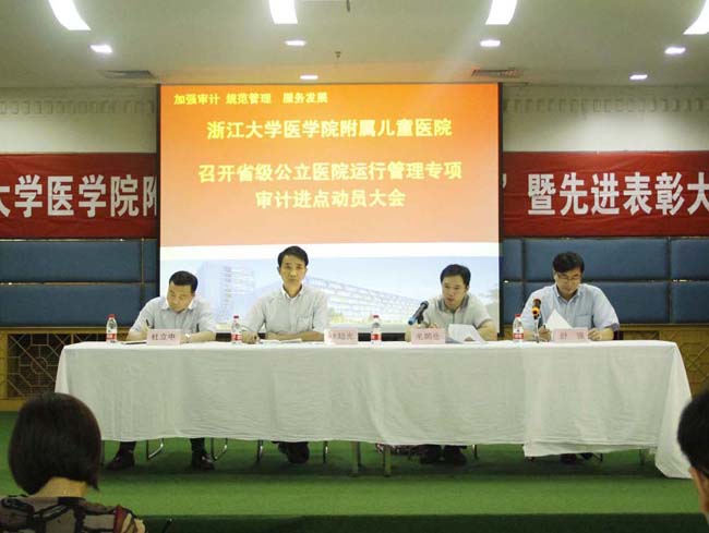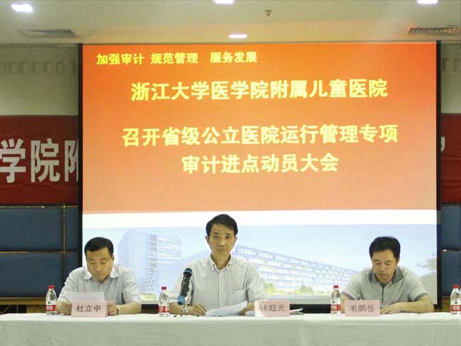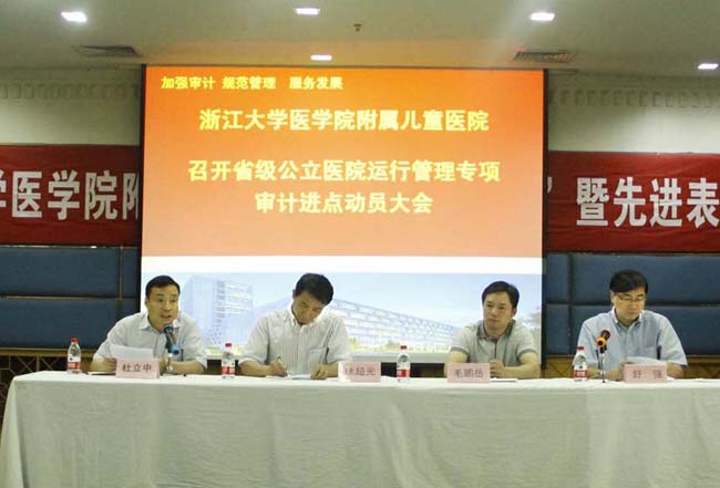 来源: 发布时间:2014-07-032014年6月30日,根据浙江省审计厅统一部署,浙大儿童医院召开了省级公立医院运行管理专项审计进点动员大会,浙江省审计厅社会保障审计处处长徐超光,副处长、本次审计组组长毛鹏岳等领导一行5人出席会议并作指导,医院党委书记舒强作主持,院长杜立中作动员报告,全体院领导以及科主任、科室负责人、护士长及支部书记等150余人参加了会议。
